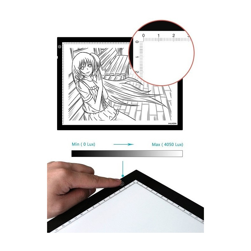 Huion A3 LED šviesos lenta pasižymi tvirtu akrilo paviršiumi ir reguliuojamu ryškumu su jutikliniu valdymu. Kompaktiškas dizainas, USB maitinimas ir piešimo pirštinė užtikrina patogumą naudojantis.