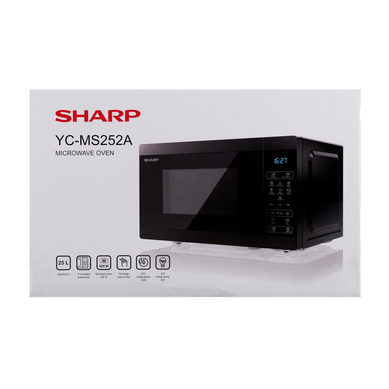 SHARP YC-MS252AE-B mikrobangų krosnelė turi 25 litrų talpą ir siūlo 11 galios lygių su 900 W mikrobangų galia. Ji turi jutiklinį valdymą, peržiūros langelį ir vaikų saugumo užraktą.