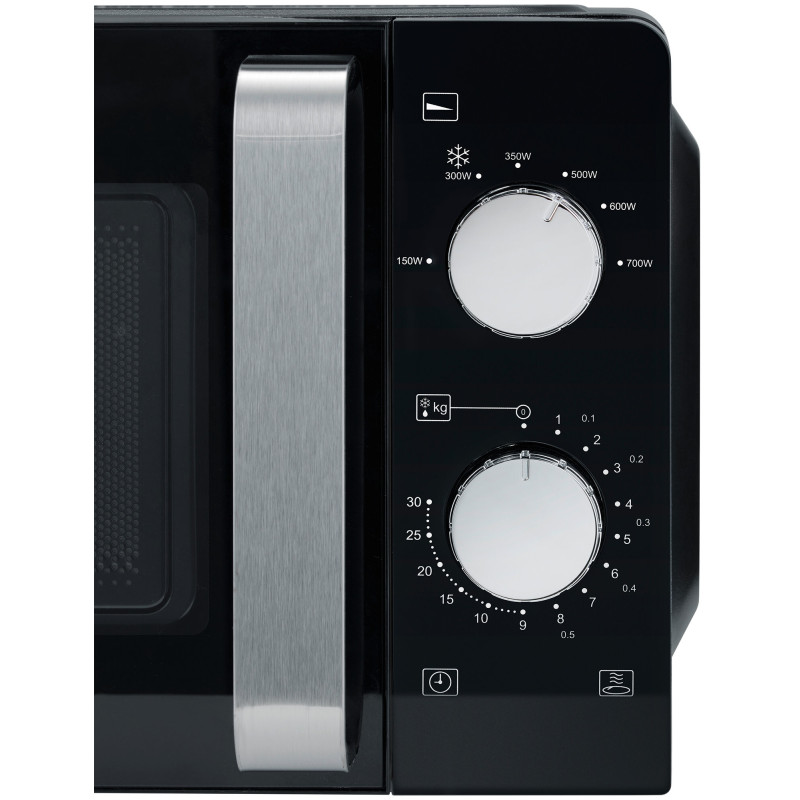 Paprasta naudoti mikrobangų krosnelė turi šešis galios lygius, kurių maksimali galia yra 700 W. Jie taip pat apima atitirpinimo funkciją, skirtą švelniai atitirpinti šaldytus produktus. Norimą galios lygį lengva pasirinkti naudojant mikrobangų krosnelės mygtukus. Naudodami orkaitės rankenėles, taip pat galite naudoti laikmatį, kurį galima nustatyti iki 30 minučių.
