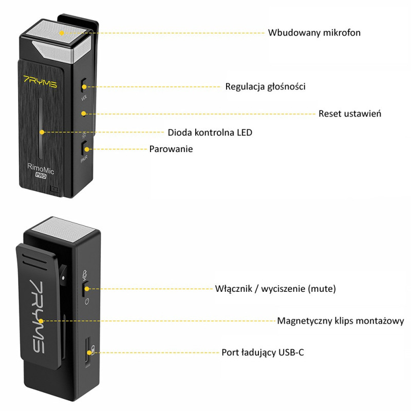 7Ryms "RimoMic PRO" komplekte yra du belaidžiai mikrofonai ir imtuvas, suderinamas su Apple iOS įrenginiais. Jis pasižymi 2.4 GHz radijo ryšiu, kurio veikimo nuotolis siekia iki 50 metrų, o baterijos veikimo laikas yra iki 6 valandų.