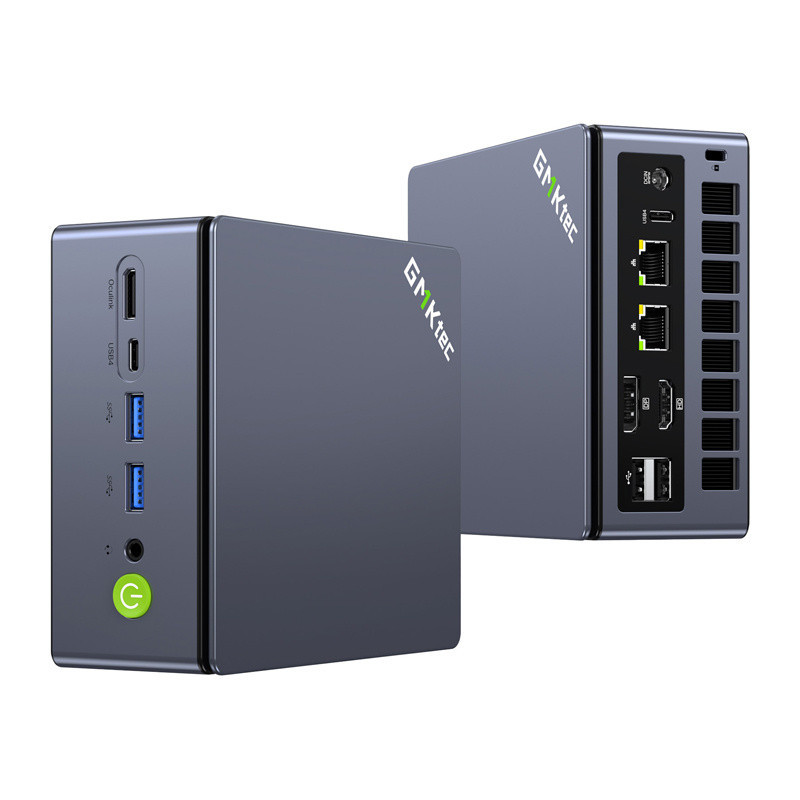 Two GMKtec mini PCs presented in vertical and horizontal orientation against the background of a monitor.