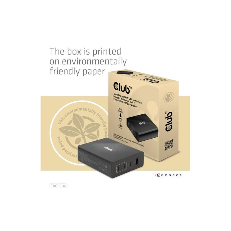 The Club 3D CAC-1906 Travel Charger 132W GAN technology, Four port USB Type-A and -C, Power Delivery(PD) 3.0 Support. This product is a high-performance, low weight travel charger with a maximum output power of 132W. Equipped with 3 USB Type-C ports and 1 Type-A port, the total output supports up to 132W, which can meet the needs of charging four devices at the same time. Compatible with multiple devices (support mobile phones,tablets and laptops). It is a convenient companion during travel and for business! Compact size & Superior Performance: GAN technology makes this charger 50% smaller than a 132W MacBook charger, small enough to carry anywhere.The 132W wall charger match a variety of PD devices from smart phones to laptops, one for all making charging simple. The Power Charger is light weight without compromising on Quality and safety. By adopting Power Delivery(PD) charging technology, this versatile Power Charger provides you with charging function through USB Type-C interface, you can charge any connected Mobilephone / Tablet / NoteBook.