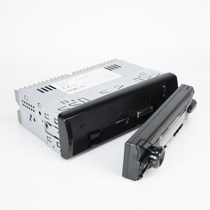 Automobilinis radijas su MP3 grotuvu ir nuimamu ciferblatu, FM radiju, AUX, Bluetooth, USB ir SD kortele.