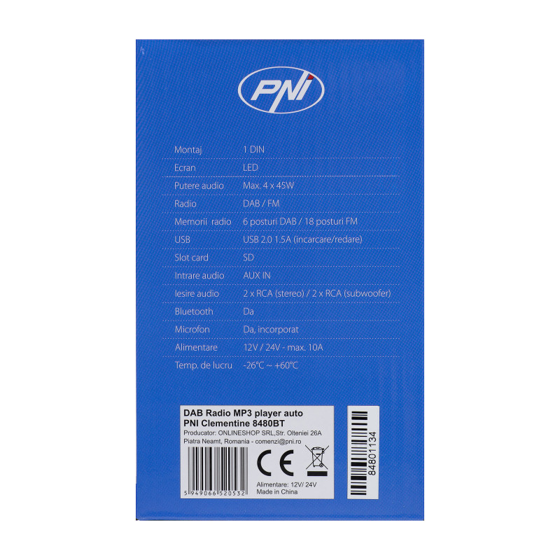 DAB radijo MP3 automobilio grotuvas PNI Clementine 8480BT 4x45w, 12/24V, 1 DIN, su SD, USB, AUX, RCA, „Bluetooth“ ir USB 1.5A telefono įkrovimui