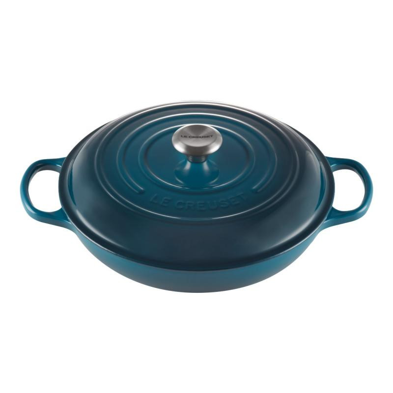 Le Creuset Signature seklių troškintuvų puodas, pagamintas iš ketaus, turi 30 cm skersmenį ir gilią žalią spalvą. Jis tinka naudoti ant viryklės, orkaitėje ir indukciniuose kaitlentėse, o lengvai valomas emaliuotas vidus ir ergonomiškos rankenos užtikrina saugų pakėlimą.