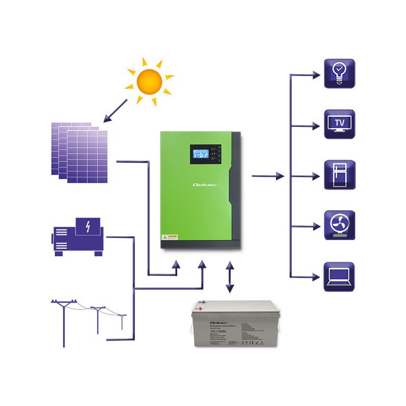 Qoltec 53887 Hybrid Solar Inverter yra nepriklausomas inverteris, kurio išėjimo galia siekia 5500 W, o MPPT įtampos diapazonas yra 120 - 450 V. Jis turi apsaugas nuo trumpojo jungimo, perkrovos ir perkaitimo, todėl puikiai tinka saulės energijos sistemoms.