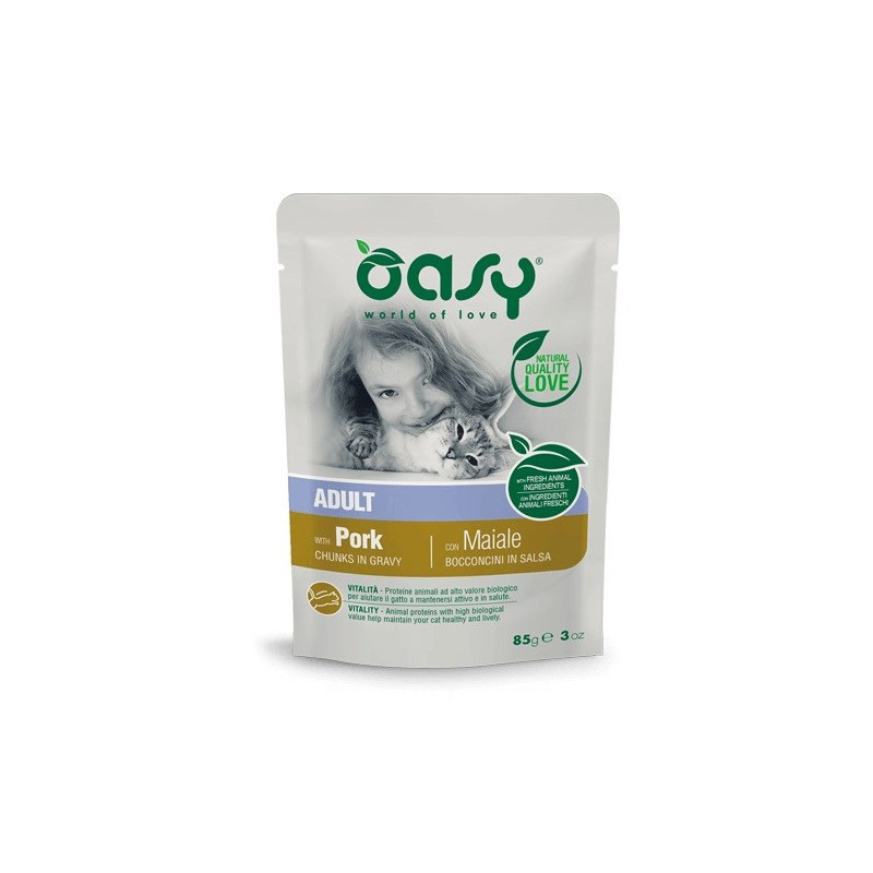 OASY Chunks in gravy Pork yra drėgnas kačių maistas, sukurtas suaugusiems katėms. Jame nėra glitimo ir sojos, o baltymų kiekis sudaro 8%, drėgmės - 83%.