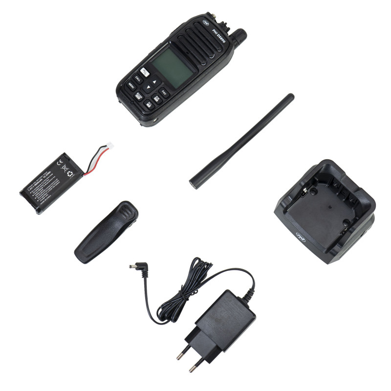 Nešiojama jūrinė radijo stotis PNI DS890, 88 kanalai, 10 orų kanalų, reguliuojamas triukšmo slopinimas, „Roger Beep“, dvigubas stebėjimas, nuskaitymas, skambutis, NRC (triukšmo mažinimo grandinė), 7 spalvų foninis apšvietimas, klavišų garsas, 1800 mAh baterija, IP67