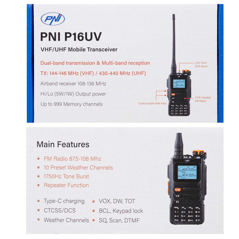 Nešiojama VHF/UHF radijo stotis PNI P16UV, 999 kanalai, dviejų dažnių TX ir 6 dažnių RX, VOX perdavimas, skenavimas, FM radijas, orų kanalai, ličio jonų 2600 mAh baterija