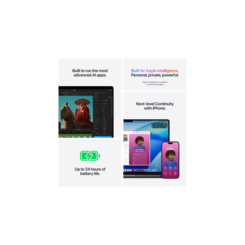 | Žaibas | Trys „Thunderbolt 5“ (USB-C) prievadai, palaikantys: įkrovimą, „DisplayPort“, „Thunderbolt 5“ (iki 120 Gb/s), „Thunderbolt 4“ (iki 40 Gb/s), USB 4 (iki 40 Gb/s). |