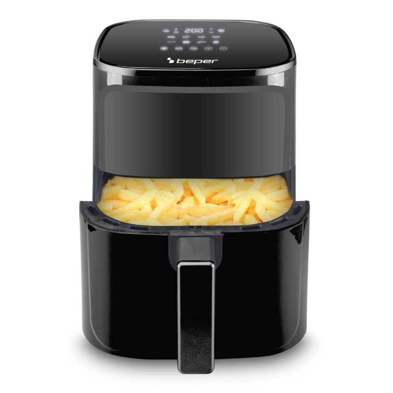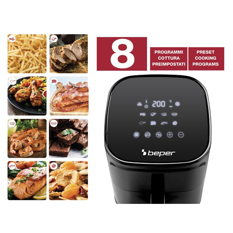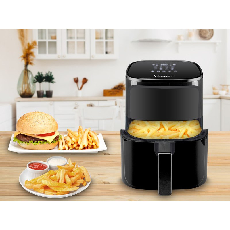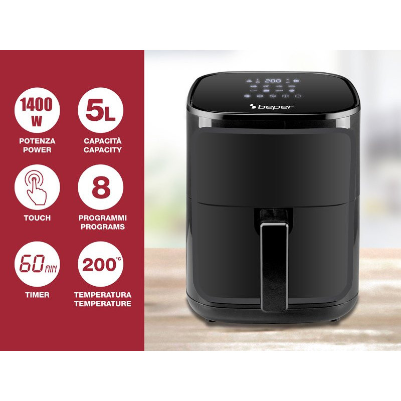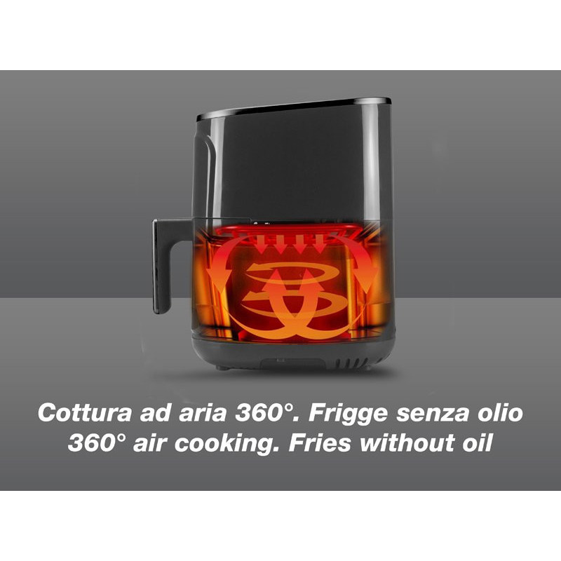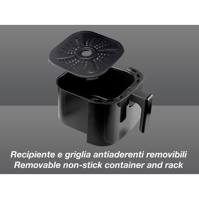 Karšto oro gruzdintuvė yra sveikiausia alternatyva tradiciniam kepimui, nes ji leidžia kepti be aliejaus arba su labai mažu kiekiu aliejaus. Taip pat idealiai tinka kepimui orkaitėje, orkaitėje ir ant grotelių. Skaitmeninis valdymo skydelis su jautriu jutikliu, leidžiančiu pasirinkti iš 8 iš anksto nustatytų programų, reguliuoti temperatūrą nuo 80 iki 200 °C ir nustatyti laikmatį iki 60 minučių. 5 litrų talpos indas ir nuimamos nelimpančios aliuminio grotelės, kad būtų lengva valyti. Apsauga nuo perkaitimo.