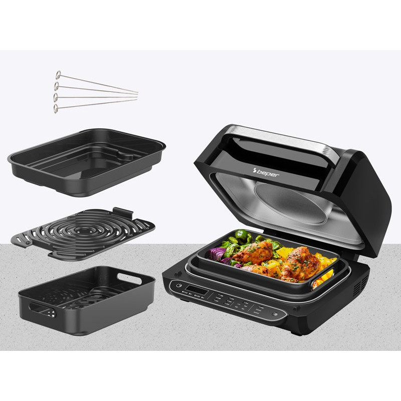 Priedai: neprideganti keptuvė, nepridegančios grotelės, nepridegantis krepšelis, 4 plieninių iešmelių rinkinys ir dvigubas šepetys valymui