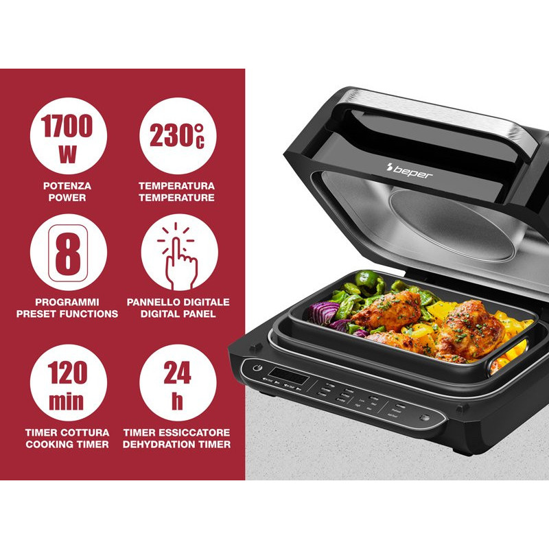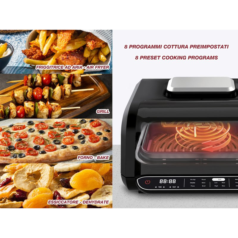 Kepimas be aliejaus dėka didelės spartos karšto oro cirkuliacijos. Pica, fokača ir šaldyti maisto produktai.
