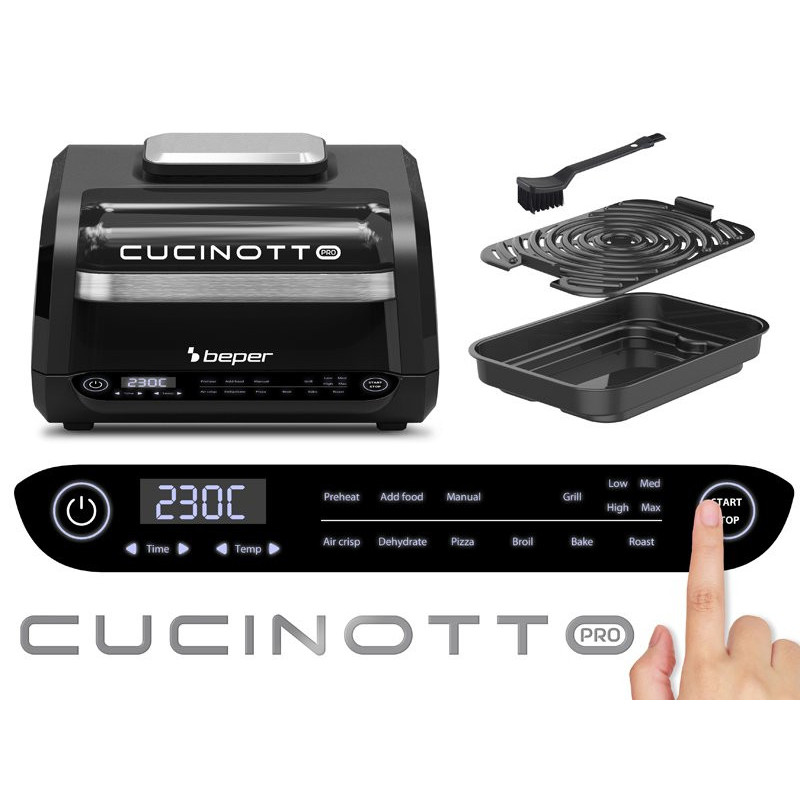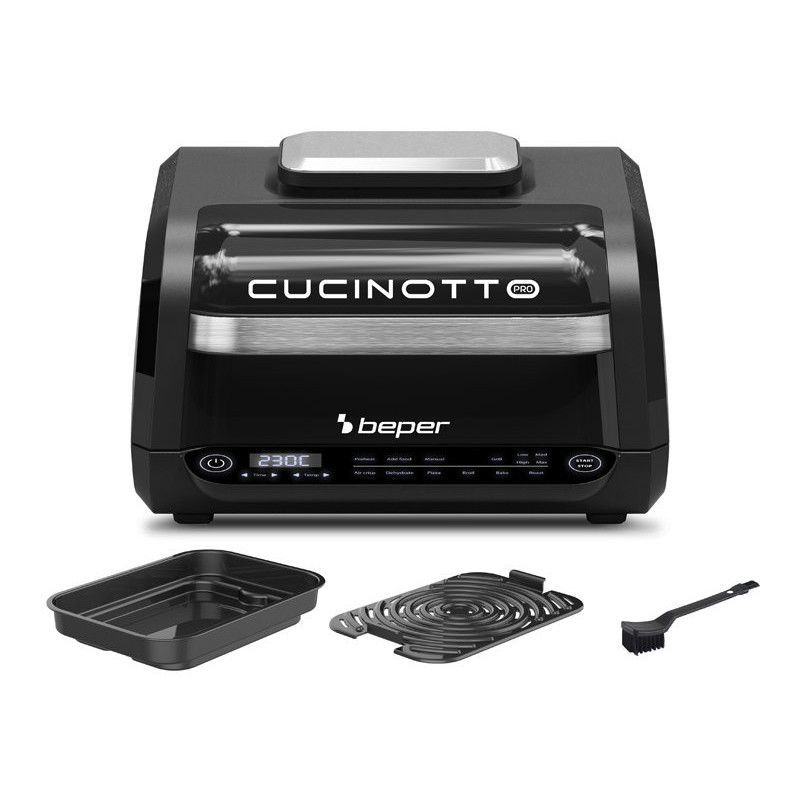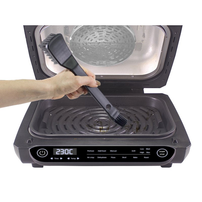 Lengva priežiūra: nuimamos grotelės su apsauga nuo taškymosi; neprideganti keptuvė ir grotelės; dvigubas valymo šepetėlis pridedamas.