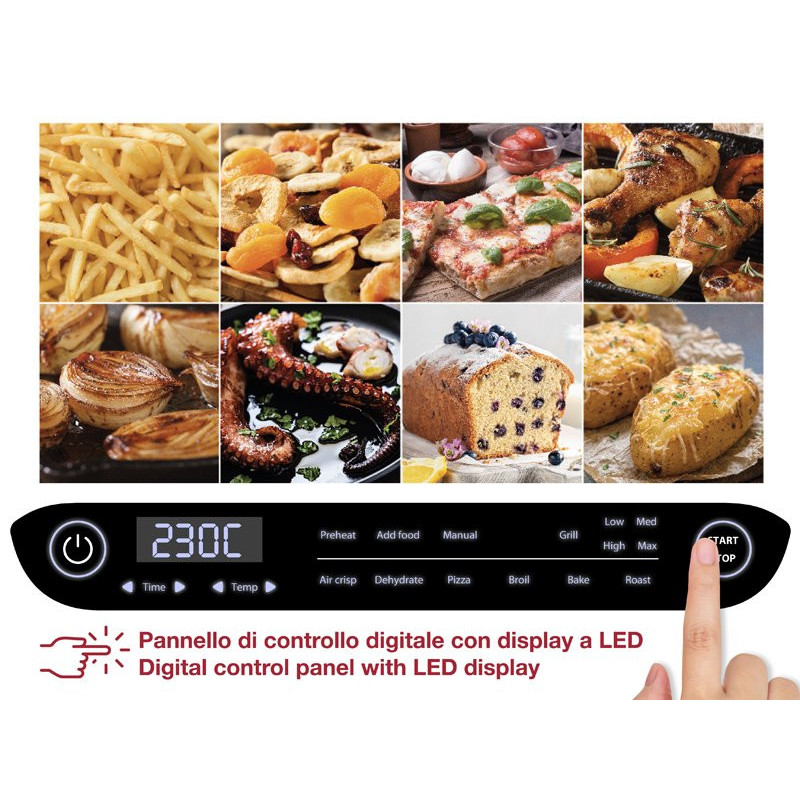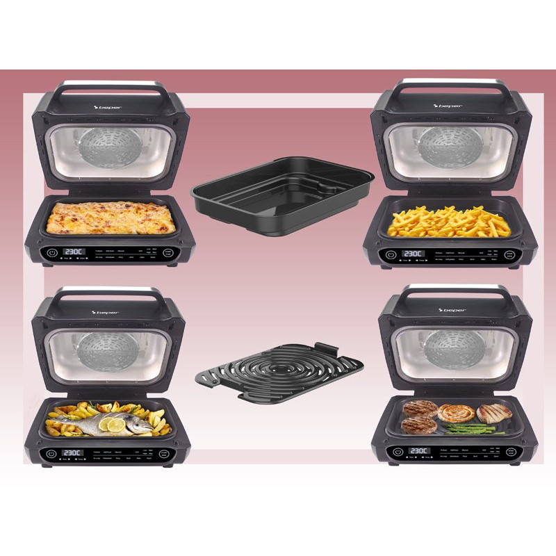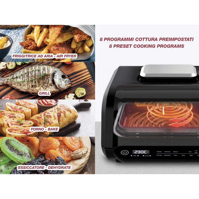 8 kepimo programos: kepimas orkaitėje, kepimas orkaitėje, grilis (4 lygiai), džiovinimas, kepimas orkaitėje, pica, grilis ir rankinis režimas.