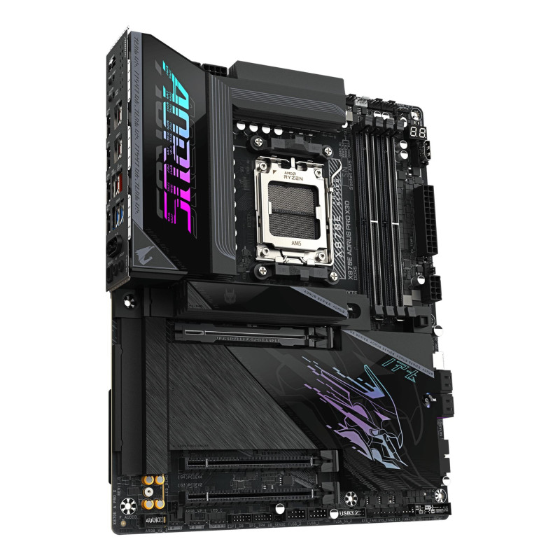 | Summary | GIGABYTE X870E AORUS PRO X3D Motherboard - Supports AMD Ryzen 9000 CPUs, 18+2+2 Phases Digital VRM, up to 9000Hz DDR5 (OC), 2xPCIe 5.0 + 2xPCIe 4.0, Wi-Fi 7, 5GbE LAN, USB 4. Processor manufacturer: AMD, Processor socket: Socket AM5, Compatible processor series: AMD Ryzen 7000 Series, AMD Ryzen 8000 Series, AMD Ryzen 9000 Series. Supported memory types: DDR5-SDRAM, Maximum internal memory: 256 GB, Memory slots type: DIMM. Supported storage drive interfaces: M.2, PCI Express 4.0, PCI Express 5.0, SATA III, Supported storage drive types: HDD & SSD, RAID levels: 0, 1, 5, 10. Maximum resolution: 4096 x 2304 pixels. Ethernet interface type: 2.5 Gigabit Ethernet, 5 Gigabit Ethernet, Fast Ethernet, Gigabit Ethernet, LAN controller: Realtek RTL8126, Top Wi-Fi standard: Wi-Fi 7 (802.11be) |