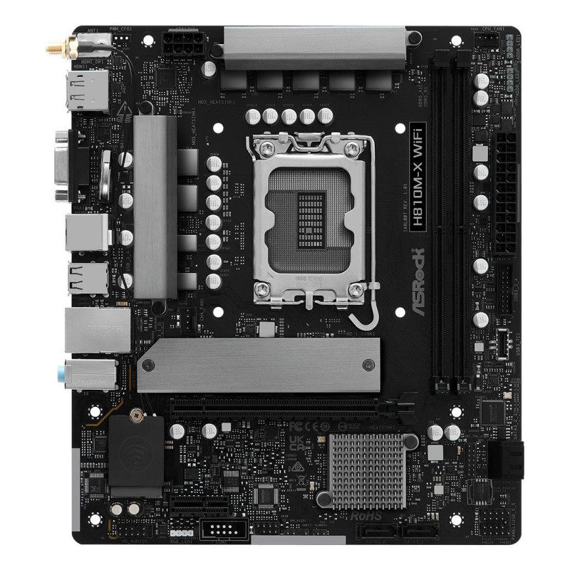 Summary Asrock H810M-X WiFi. Processor manufacturer: Intel, Processor socket: LGA 1851 (Socket V1), Compatible processor series: Intel Core Ultra (Series 2). Supported memory types: DDR5-SDRAM, Maximum internal memory: 128 GB, Memory slots type: DIMM. Supported storage drive interfaces: M.2, SATA III, Supported storage drive types: HDD & SSD. Ethernet interface type: 2.5 Gigabit Ethernet, LAN controller: Dragon RTL8125BG, Top Wi-Fi standard: Wi-Fi 5 (802.11ac). Component for: PC, Motherboard form factor: micro ATX, Motherboard chipset family: Intel
