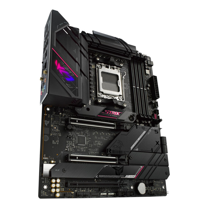 Drąsus ir elegantiškas ROG Strix B650E-E pasižymi aukščiausios klasės estetika, panašia į „Electro Punk“ periferinių įrenginių seriją. Juodi gaubtai dengia SSD diskus ir lustų rinkinį su kontrastingomis milteliniu būdu dažyto ir šlifuoto metalo tekstūromis, o žaismingi rožiniai akcentai traukia žvilgsnį aplink plokštę. Įvesties/išvesties gaubtą puošia padalintas ROG akies atvaizdas, kurios centre gali būti pritaikomas RGB apšvietimas.