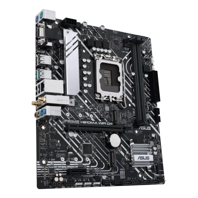 Summary ASUS PRIME H610M-A WIFI D4. Processor manufacturer: Intel, Processor socket: LGA 1700, Compatible processor series: Intel® Celeron®, Intel® Core™ i3, Intel® Core™ i5, Intel® Core™ i7, Intel® Core™ i9,.... Supported memory types: DDR4-SDRAM, Maximum internal memory: 64 GB, Memory slots type: DIMM. Supported storage drive interfaces: M.2, SATA, Supported storage drive types: HDD & SSD. Ethernet interface type: Gigabit Ethernet, Top Wi-Fi standard: Wi-Fi 5 (802.11ac), Wi-Fi standards: 802.11a, 802.11b, 802.11g, Wi-Fi 4 (802.11n), Wi-Fi 5 (802.11ac). Component for: PC, Motherboard form factor: micro ATX, Motherboard chipset family: Intel