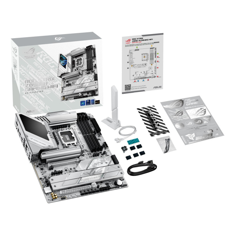 | Summary | ASUS ROG STRIX Z890-A GAMING WIFI. Processor manufacturer: Intel, Processor socket: LGA 1851 (Socket V1), Compatible processor series: Intel Core Ultra (Series 2). Supported memory types: DDR5-SDRAM, Maximum internal memory: 192 GB, Memory slots type: DIMM. Supported storage drive interfaces: M.2, SATA III, Supported storage drive types: HDD & SSD, RAID levels: 0, 1, 5, 10. Ethernet interface type: 2.5 Gigabit Ethernet, Top Wi-Fi standard: Wi-Fi 7 (802.11be), Wi-Fi standards: 802.11a, 802.11b, 802.11g, Wi-Fi 4 (802.11n), Wi-Fi 5 (802.11ac), Wi-Fi 6 (802.11ax), Wi-Fi 6E.... Component for: PC, Motherboard form factor: ATX, Motherboard chipset family: Intel |