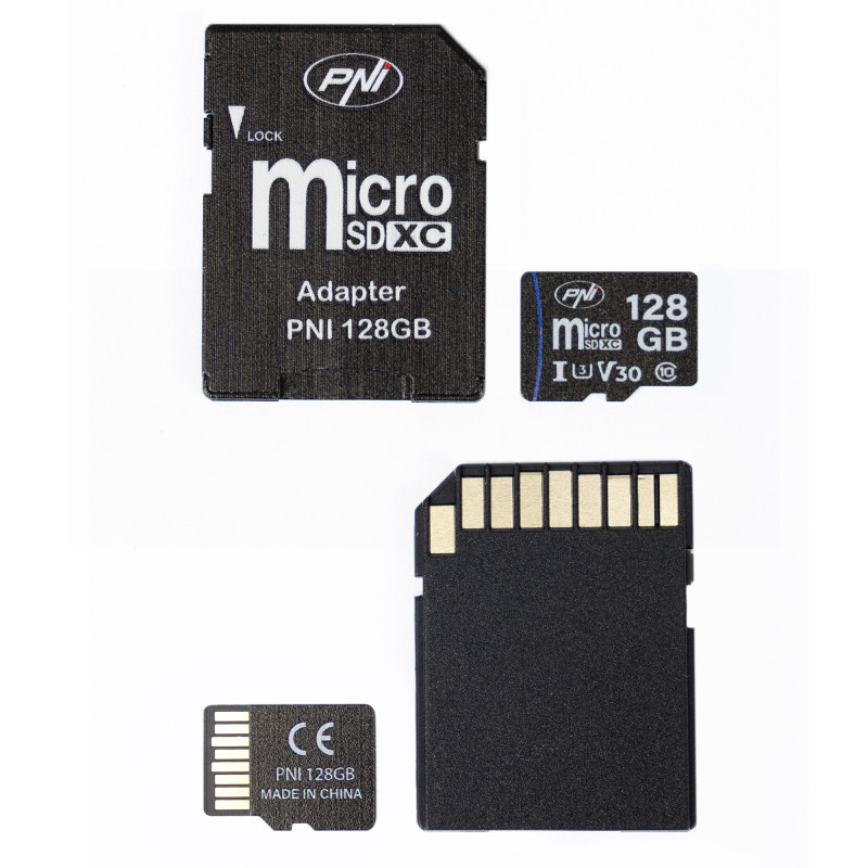 Pakuotėje 2 vnt. PNI MicroSD atminties kortelės PNI 128GB MicroSD atminties kortelė, 10 klasė, 80 Mb/s, V30 su SD adapteriais