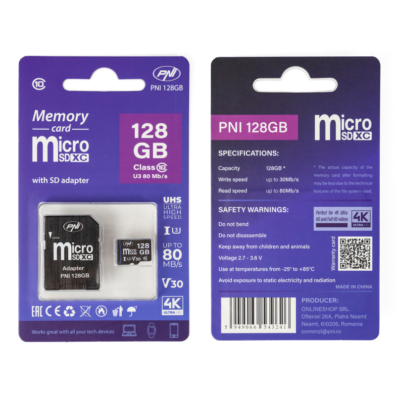 Pakuotėje 2 vnt. PNI MicroSD atminties kortelės PNI 128GB MicroSD atminties kortelė 10 klasė, 80 Mb/s, V30 su SD adapter