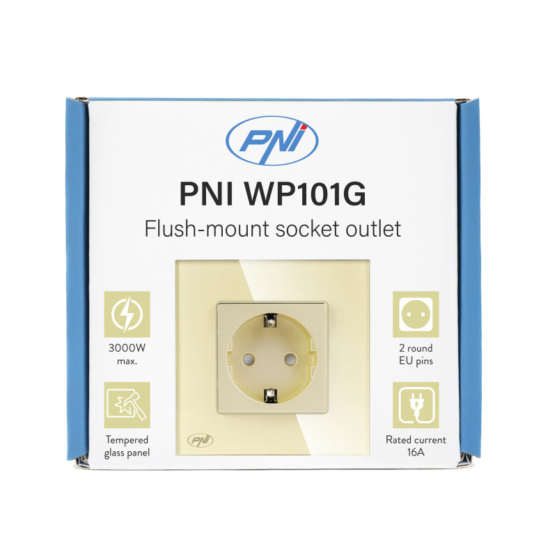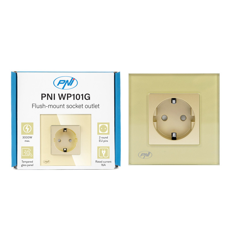 Paprastas įmontuotas lizdas PNI WP101G su stikliniu rėmeliu, aukso spalvos, 16A 3000W