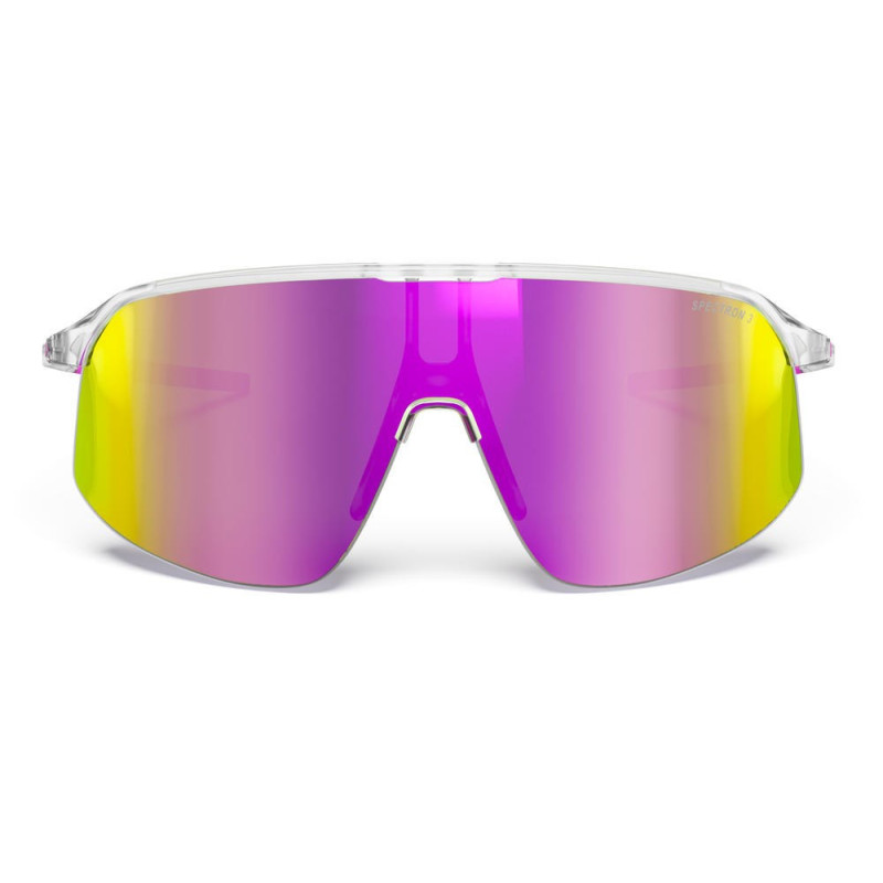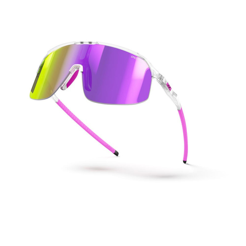 Lengvos daugiafunkcinės saulės akinių, skirtų universaliam naudojimui, su rožiniu skaidriu rėmu ir pilku vidiniu spalvų akcentu. Lęšiai leidžia 12% šviesos pralaidumą, o akinių svoris tik 20 g.
