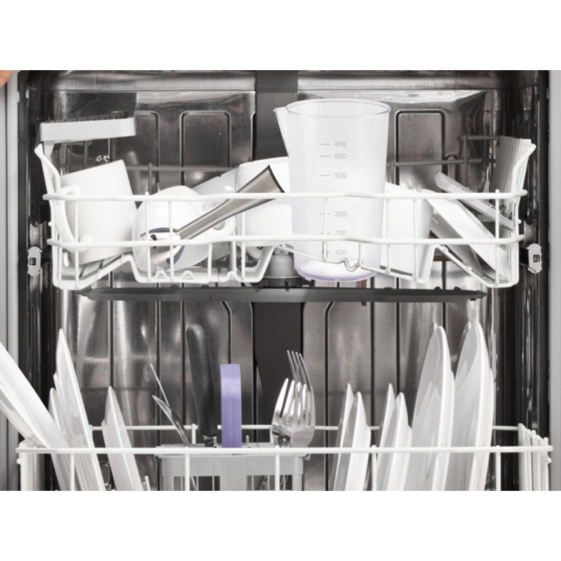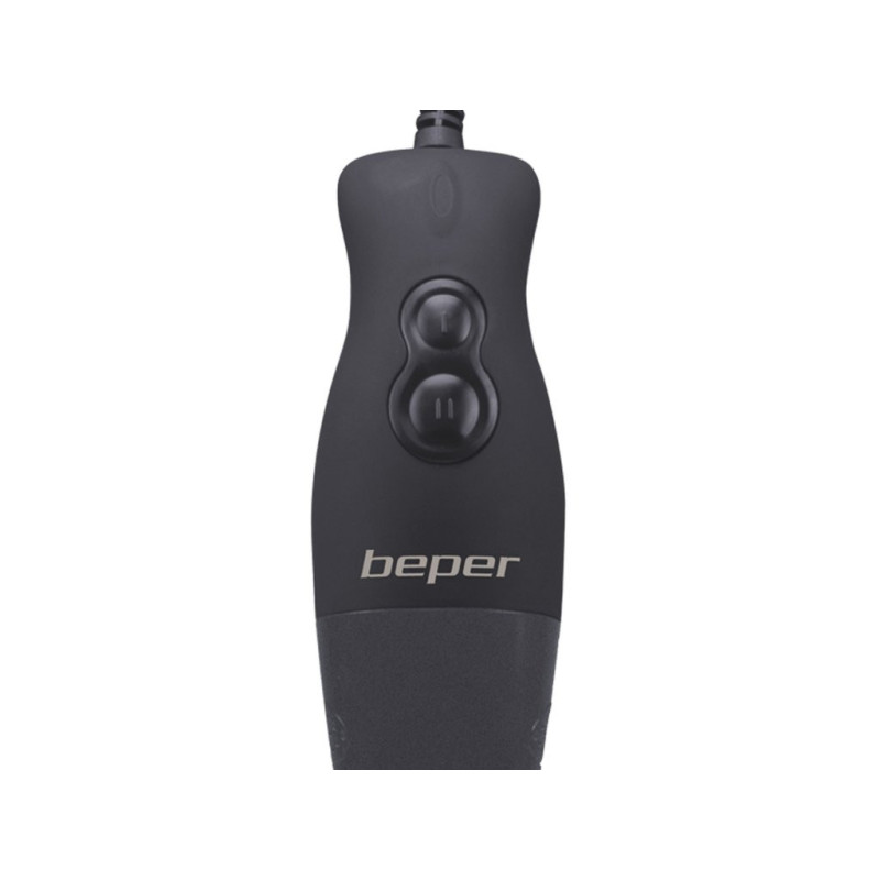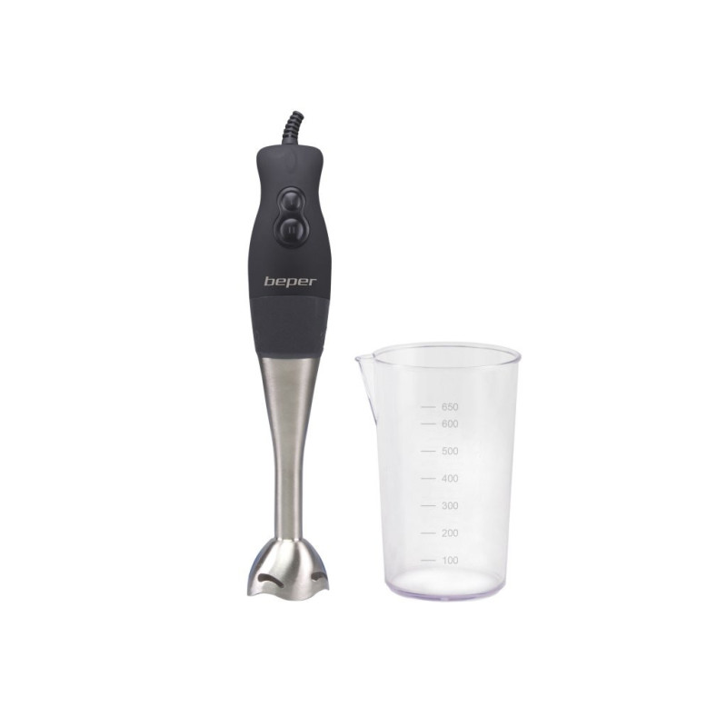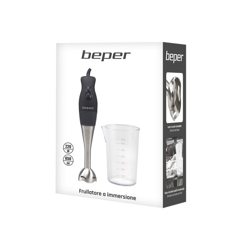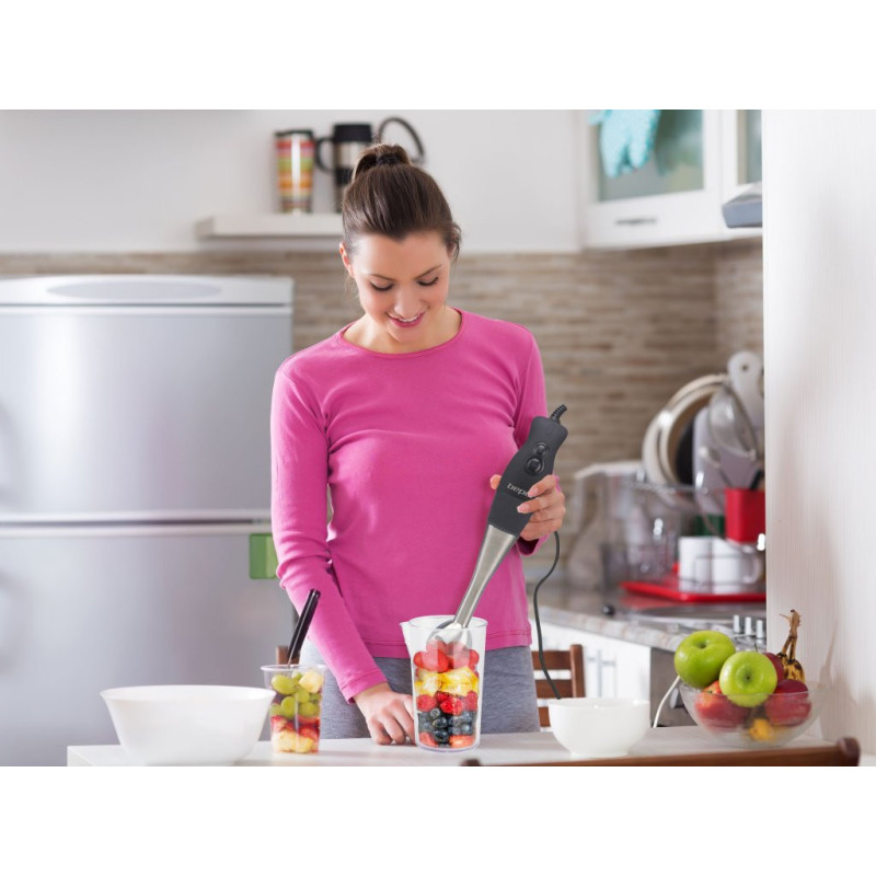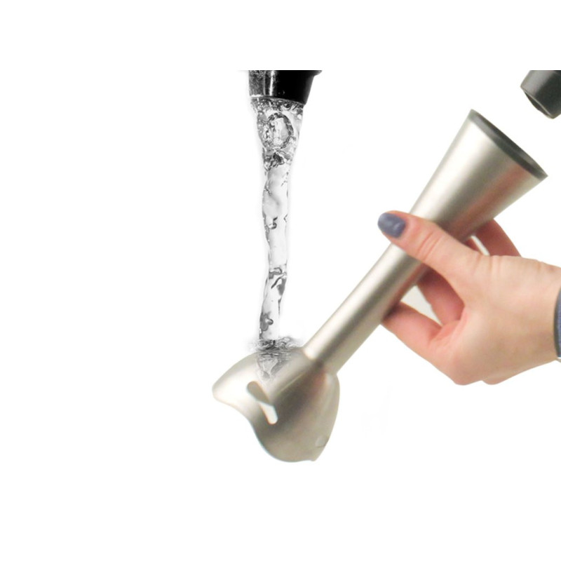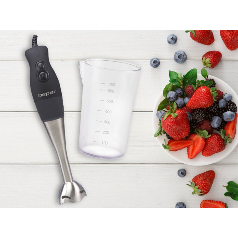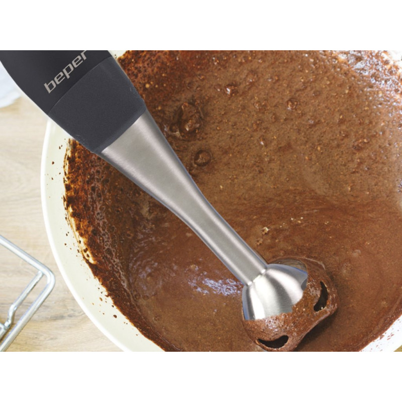 Funkcionalus panardinamasis trintuvas su guminiu ABS korpusu ir ergonomiška rankena patogiam suėmimui. 19 cm nerūdijančio plieno statinė, nuimama lengvam valymui, ir dvigubi plieniniai peiliukai. 2 greičiai pasirenkami atitinkamais mygtukais. Pridedamas 650 ml graduotas indas. Idealiai tinka aksominėms sriuboms ir kompotams ruošti.