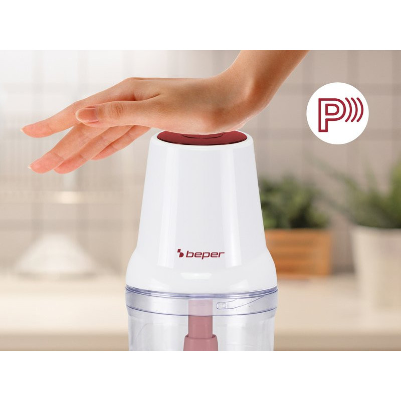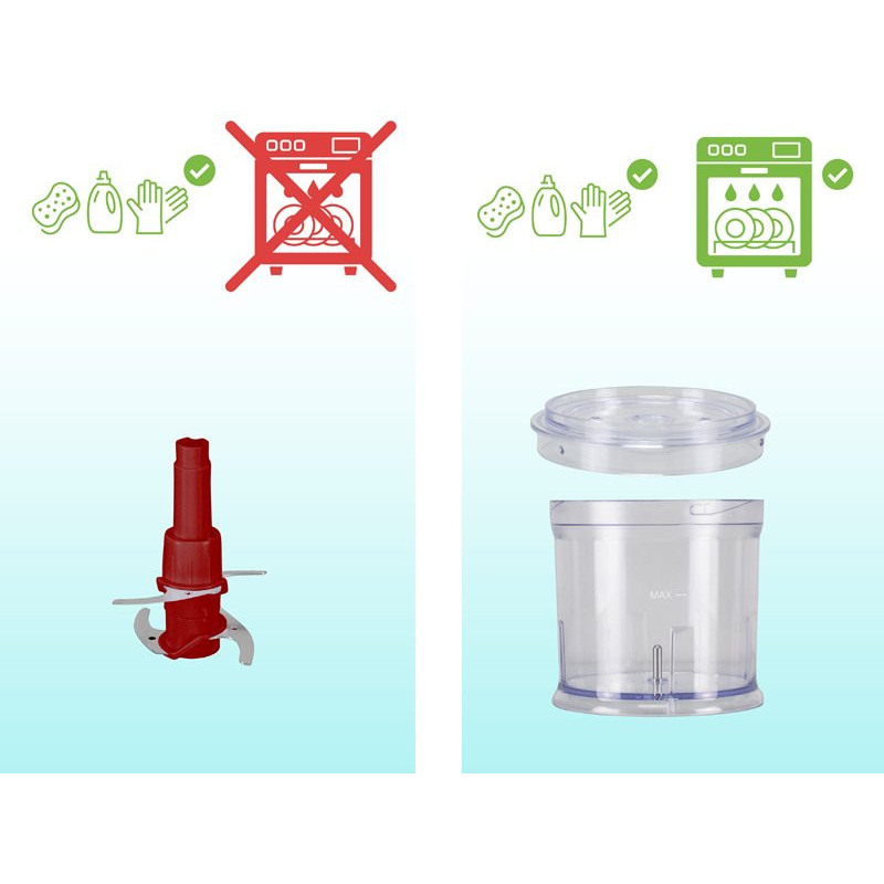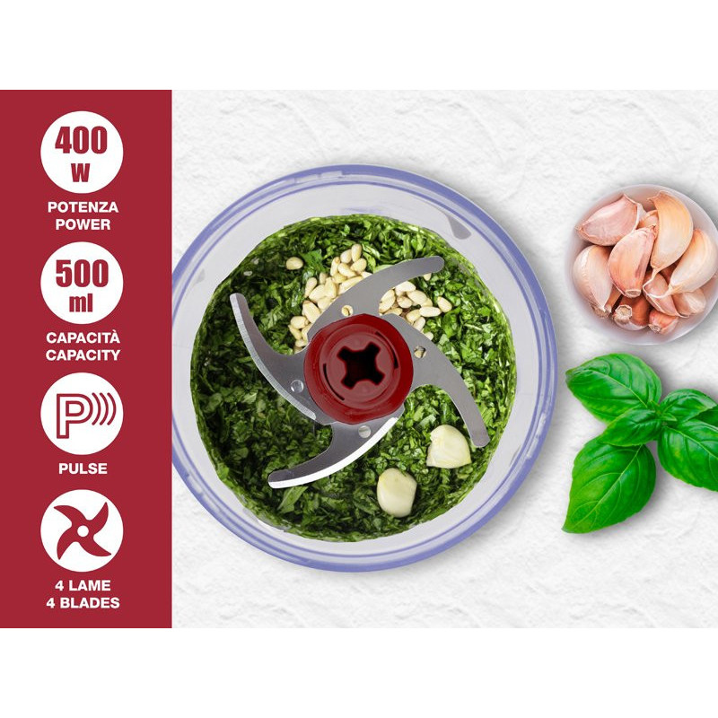 Praktiškas maisto smulkintuvas su 500 ml plastikiniu korpusu ir indu.