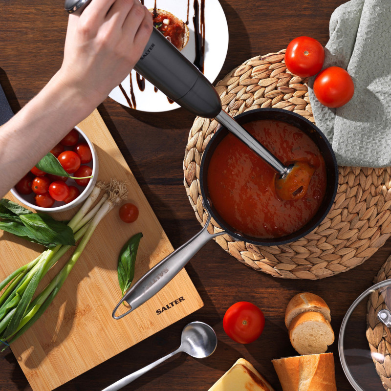 Įspūdingo 400 W variklio ir nerūdijančio plieno strypo bei peilio dėka greitai ir lengvai paruošite mėgstamas sriubas ar naminius padažus.