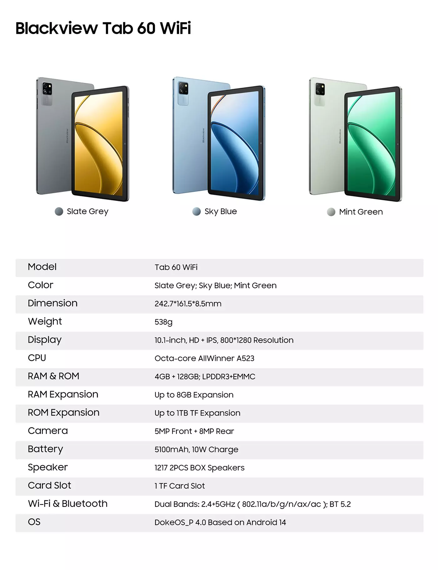 Blackview Tab 60 WiFi 4GB/128GB, 10,1 colio HD IPS 800x1340, aštuonių branduolių 1,8 GHz, 5MP priekinė / 8MP galinė kamera, 5100 mAh baterija, C tipo USB, Android 14, žalia