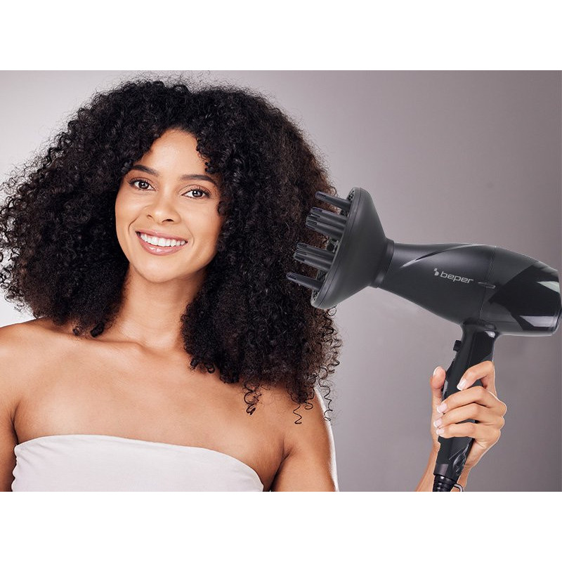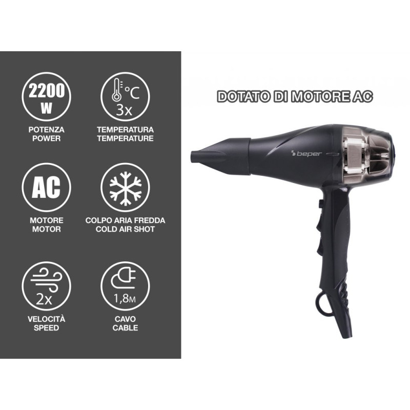 Plaukų džiovintuvas su profesionaliu 2200 W kintamosios srovės varikliu.