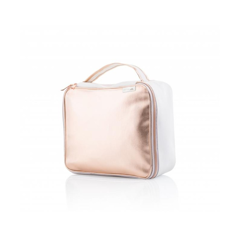 Viskas saugoma elegantiškame užtrauktuku užsegamame krepšyje , kuriame bus galima susidėti visą komplektą arba kaip erdvų kosmetikos dėklą kelionėms ir namuose.