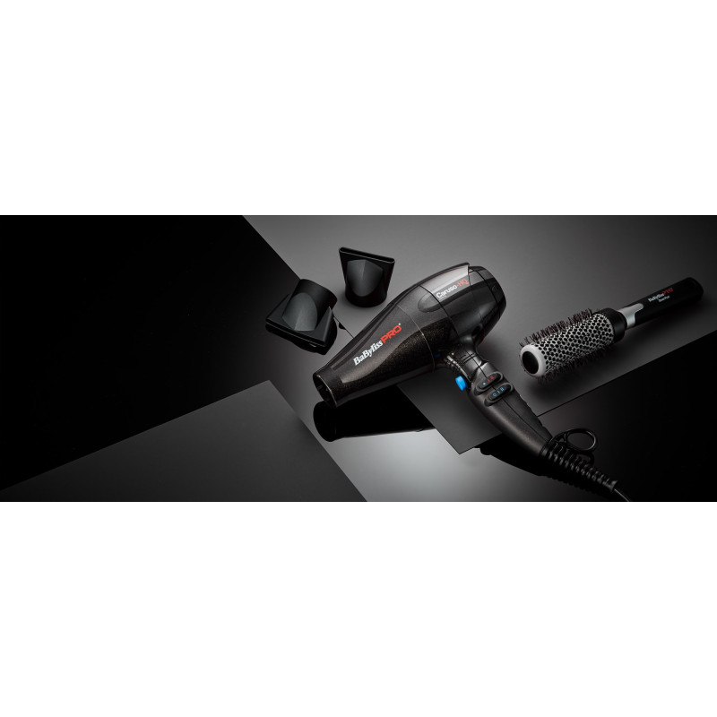 BaByliss CARUSO-HQ plaukų džiovintuvas turi 2400 W galią ir siūlo tris šildymo lygius bei tris greičio nustatymus. Jame yra joninė funkcija, šalto oro pūtimo funkcija, taip pat pridedami koncentratoriaus ir difuzoriaus antgaliai.