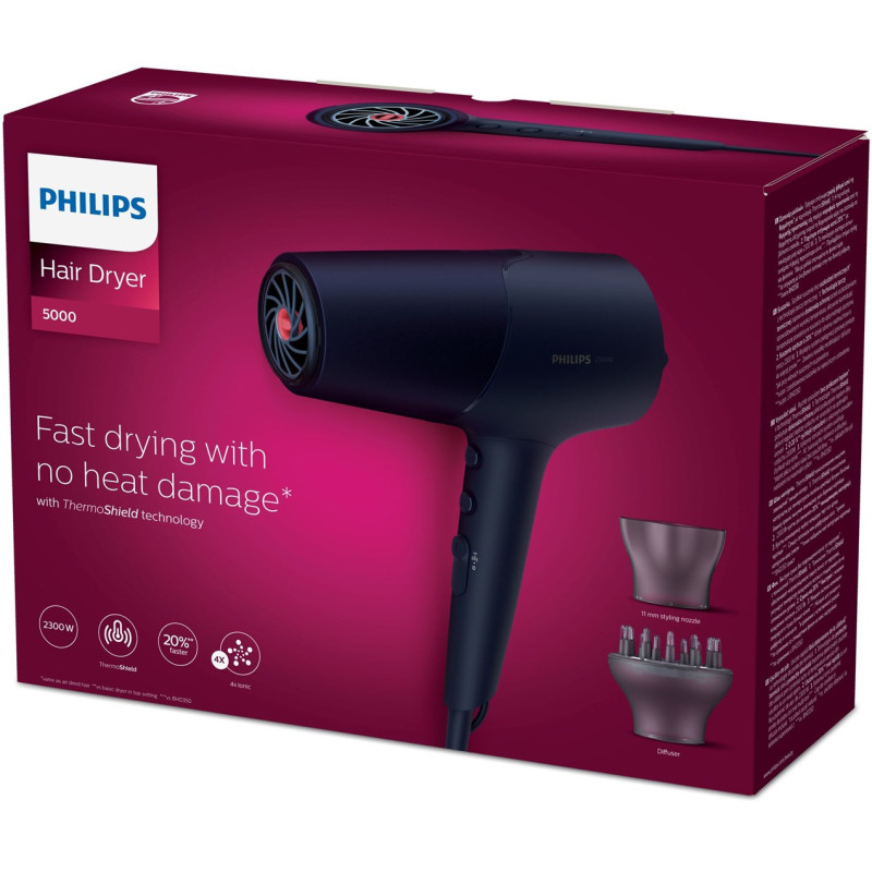 Philips 5000 serijos BHD510/00 plaukų džiovintuvas turi 2300 W galią ir 6 greičio bei šildymo lygius. Jame yra koncentratoriaus ir difuzoriaus antgaliai, taip pat joninė funkcija ir šalto oro purškimo funkcija.