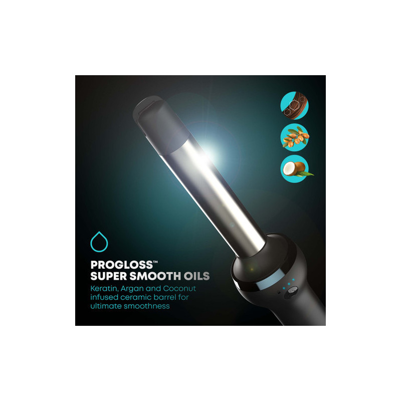 Joninis ir keraminis antgalis, praturtintas itin švelniu „Progloss™“ keratinu, argano ir kokosų aliejais