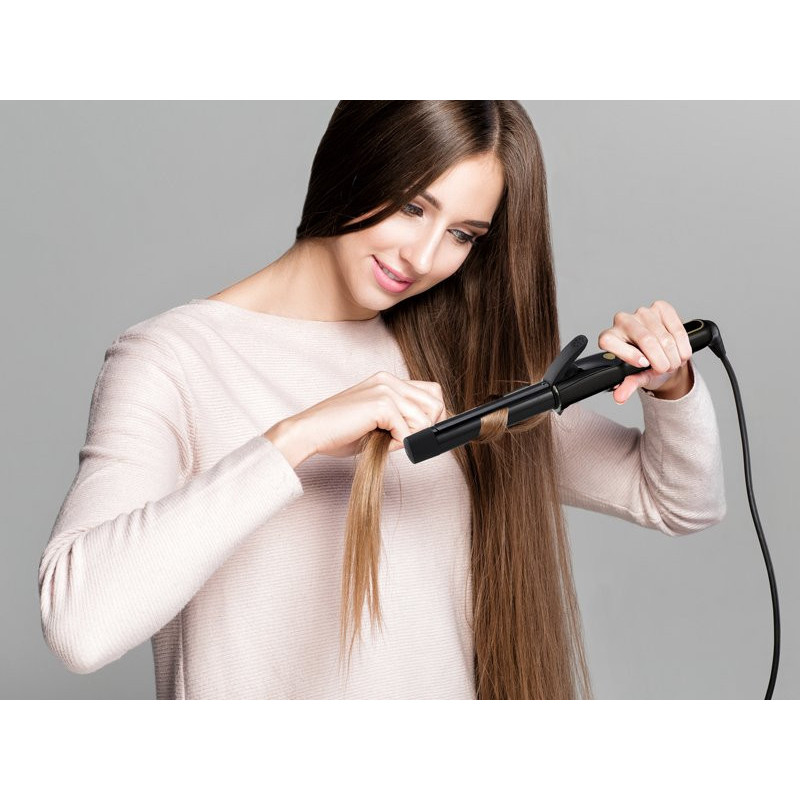 Modernaus dizaino plaukų garbanojimo žnyplės, puikiai tinkančios norint greitai sukurti aiškias bangas ir garbanas: vos per daugiau nei 1 minutę jos pasieks maksimalią 180 °C temperatūrą dėl PTC kaitinimo elementų, o keraminė danga apsaugos plaukus ir suteiks jiems blizgesio. 25 mm skersmuo – tobulos bangos ir švelnios garbanos. 360° pasukamas laidas ir šaltasis antgalis užtikrina maksimalų komfortą naudojimo metu. LED darbinis apšvietimas ir įjungimo/išjungimo jungiklis – maksimaliam saugumui.