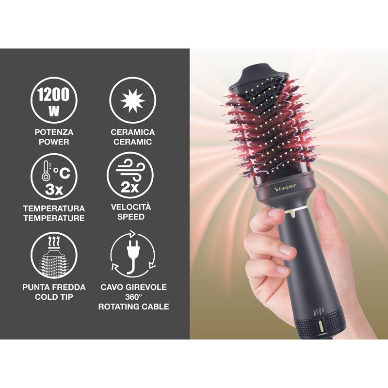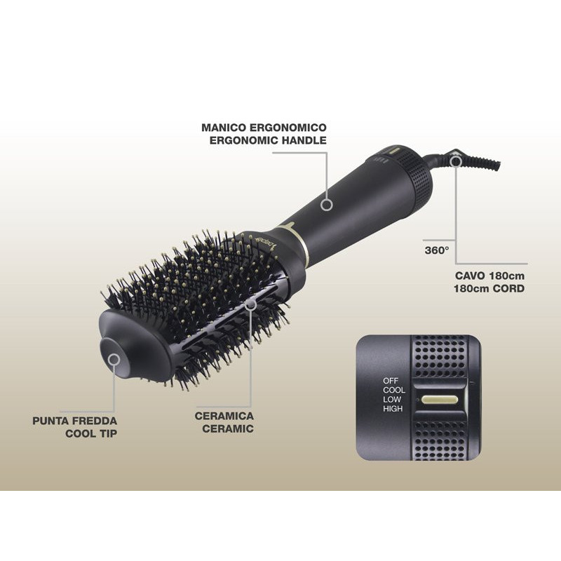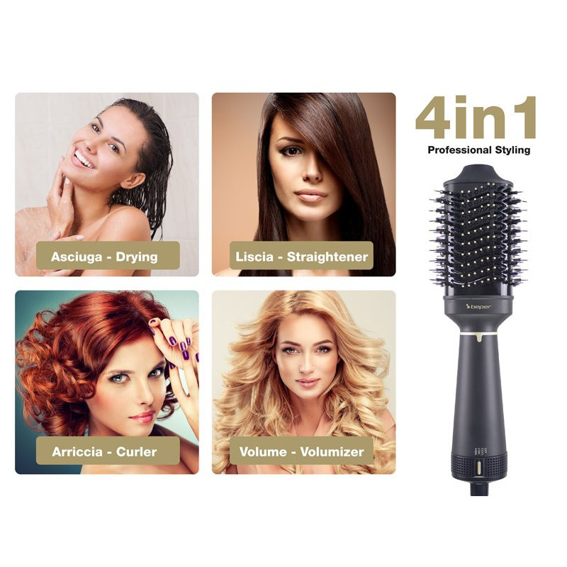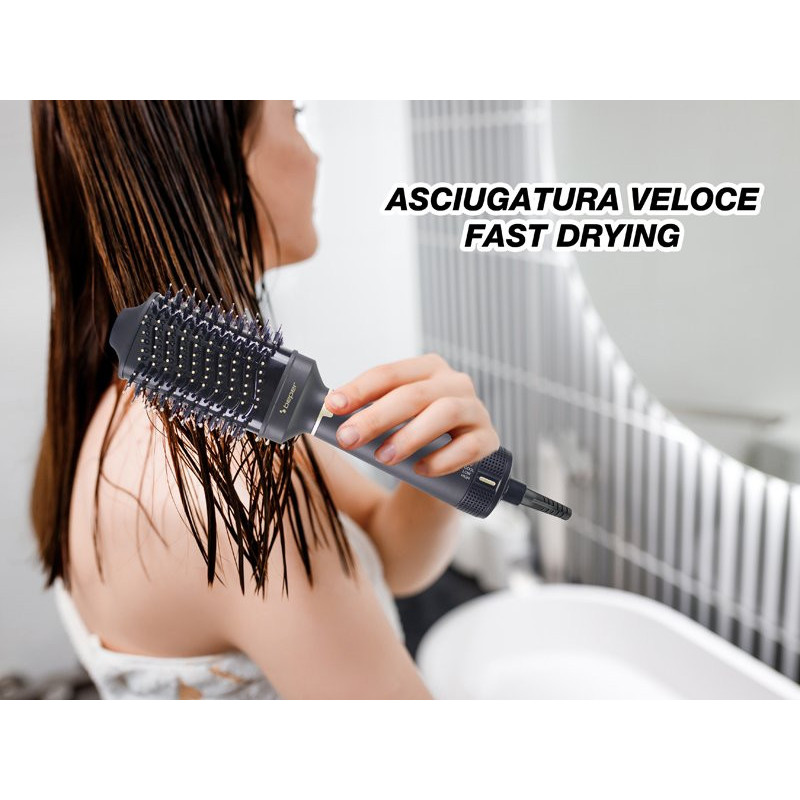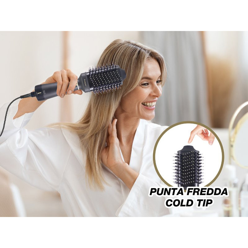 Ovalios formos plaukų džiovintuvo šepetys, kuris tiesina, suteikia apimties ir garbano plaukų galiukus.