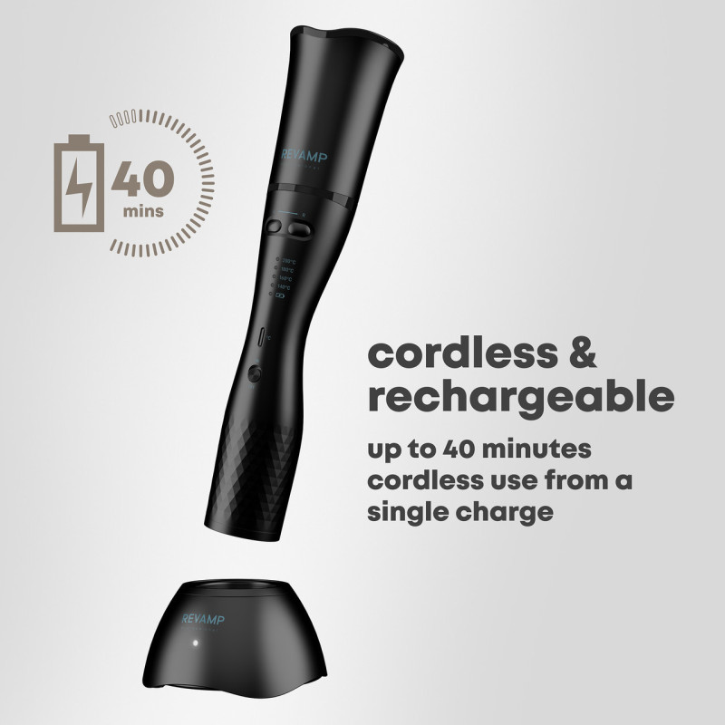 Didelio našumo, ilgai veikiantis (iki 40 minučių įprastam naudotojui) belaidis plaukų tiesintuvas ir formavimo priemonė su ličio jonų technologija