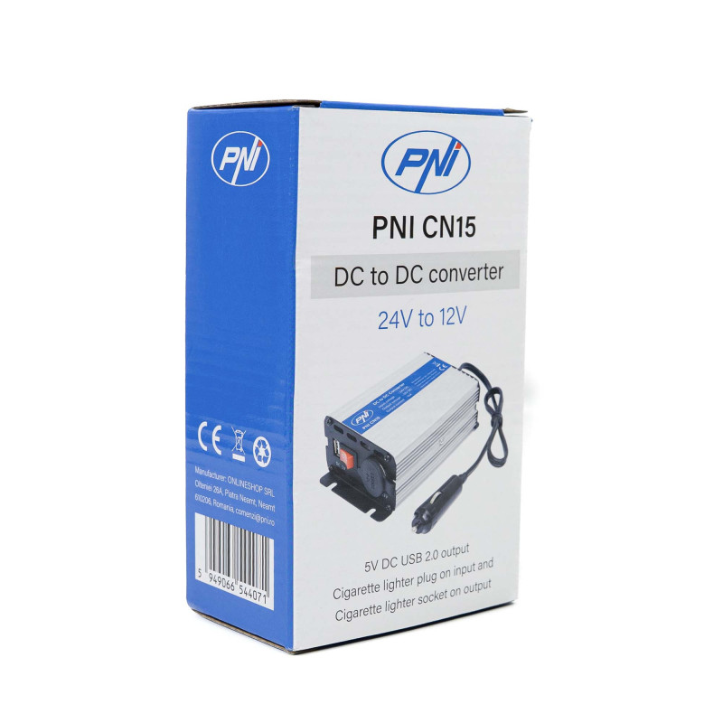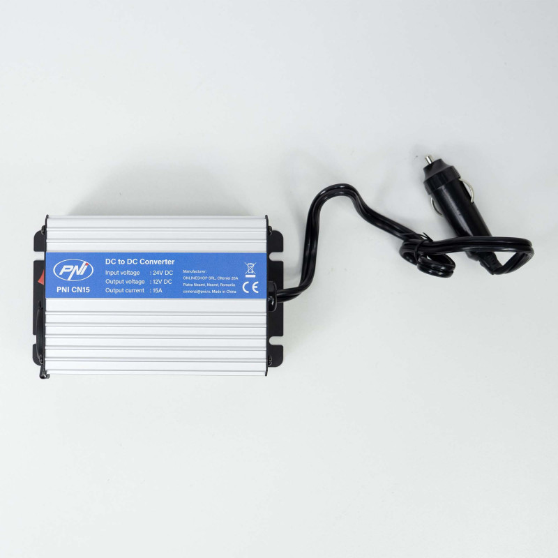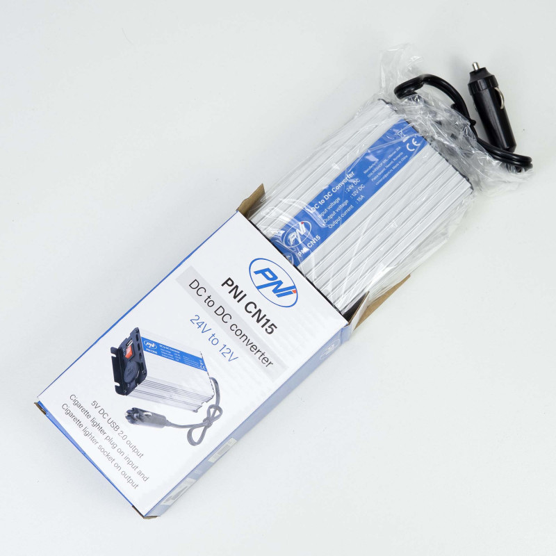 PNI CN15 įtampos keitiklis 180 W, 24–12 V, 15 A, USB 2.0, išėjimo trumpojo jungimo apsauga