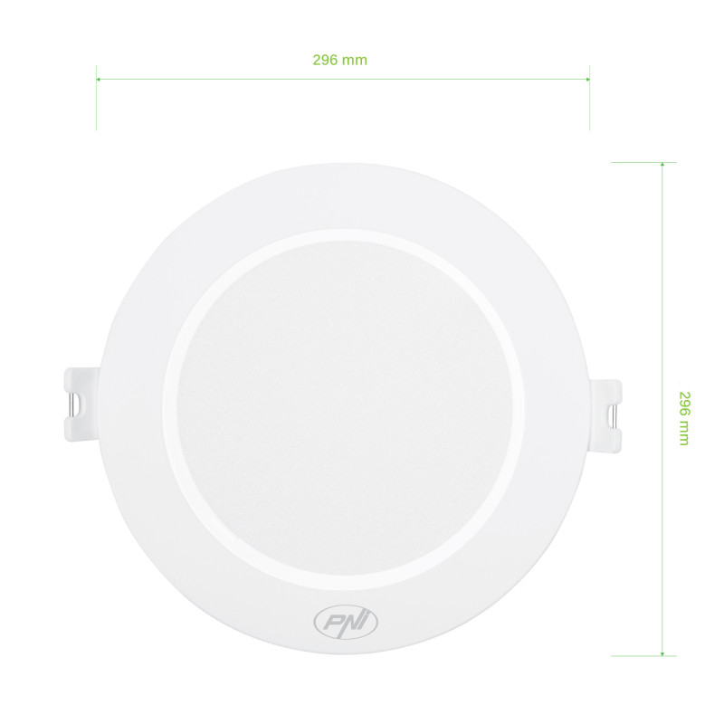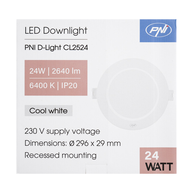 LED prožektorius PNI D-Light CL2524 24W, įleidžiamas, apvalus, 296 * 29,1 mm, 6400K, 230 V maitinimo šaltinis, 2640 lm, šaltai balta
