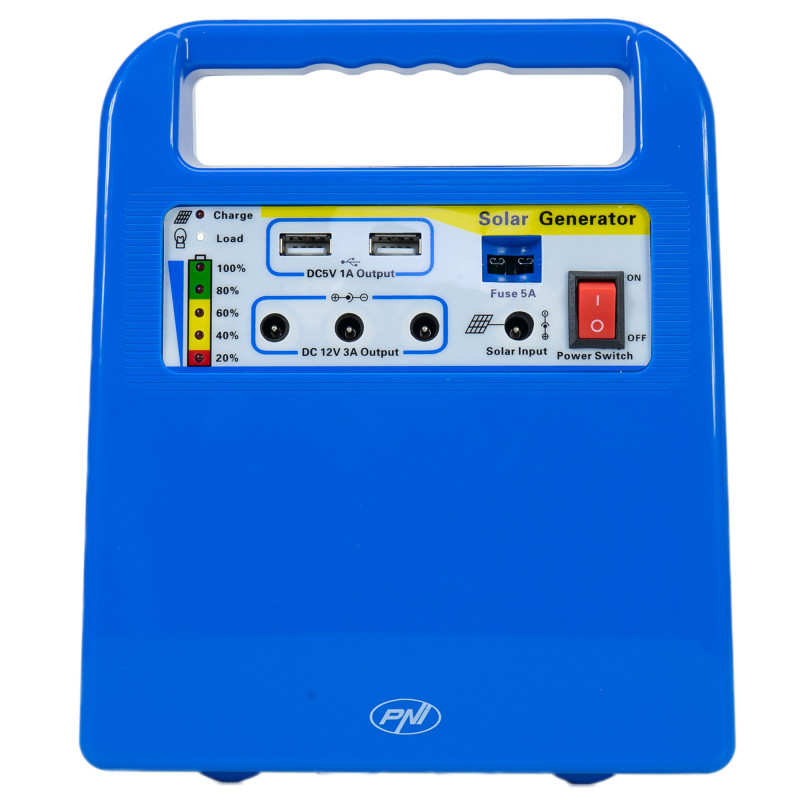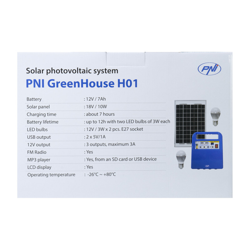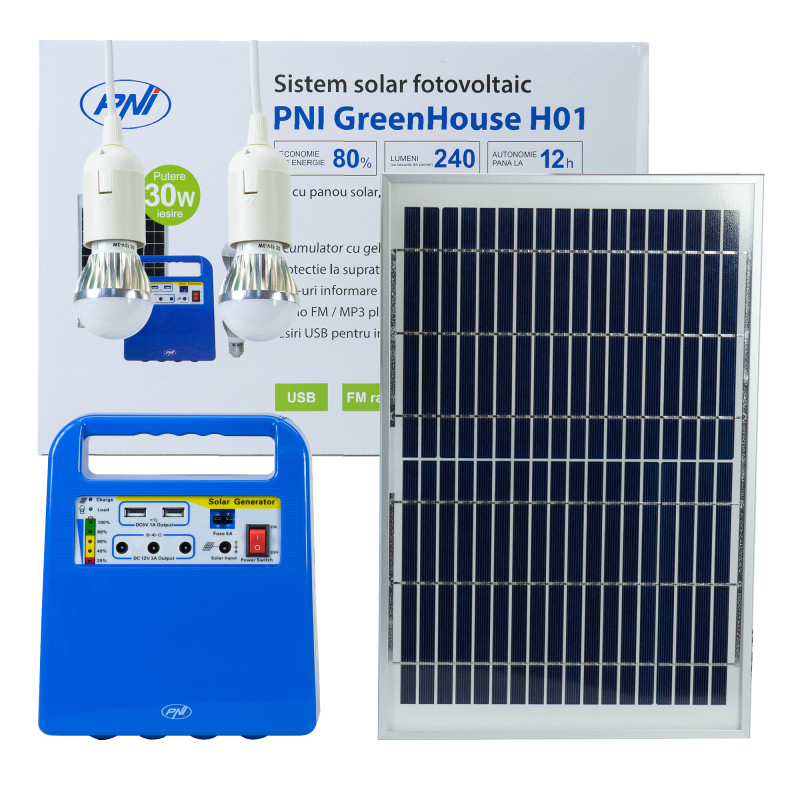 PNI GreenHouse H01 30W saulės fotovoltinė sistema su 12V / 7Ah baterija, USB / radiju / MP3, 2 LED lemputėmis