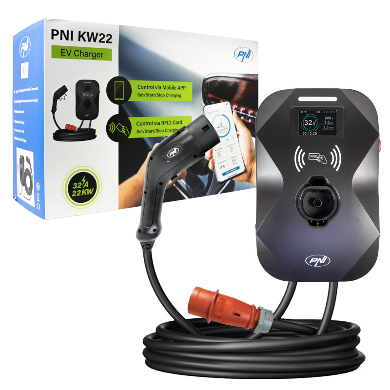 PNI KW22 32A 22KW elektromobilių įkrovimo stotelė, 380 V - 440 V trifazė, 2 tipo jungtis, ekranas, kortelė, BT, valdymas iš mobiliosios programėlės BT + RFID + APP