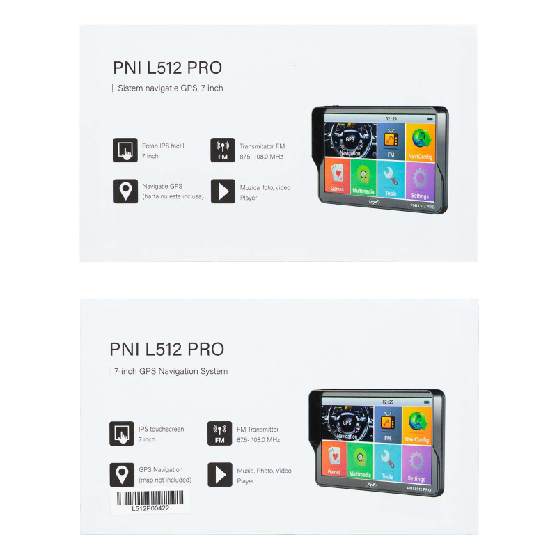 PNI L512 PRO GPS navigacijos sistema su saulės skydeliu, 7 colių, 800 MHz, 512 MB DDR, 16 GB vidinės atminties, FM siųstuvas