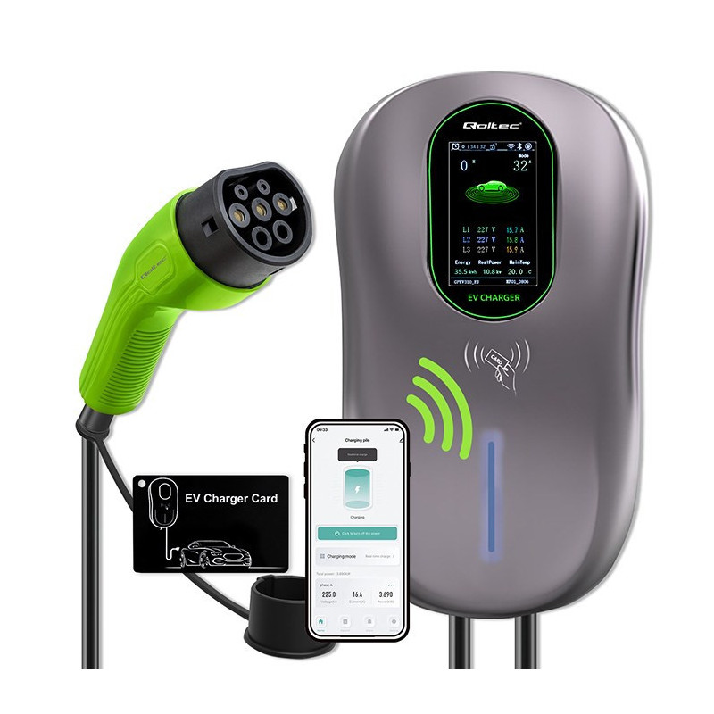 Qoltec 52430 elektromobilių įkrovimo stotelė 2 viename, 2 tipo | 22 kW | „Wi-Fi“ | LCD | RFID | 3 fazės | Sieninė dėžutė | 5 m