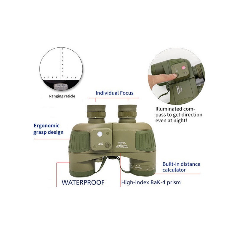 Profesionalios optikos žiūronai su pašviečiamu kompasu ir 2 nuotolio nustatymo įrankiais.