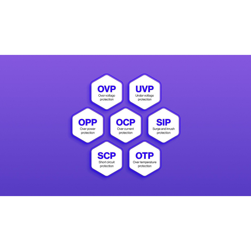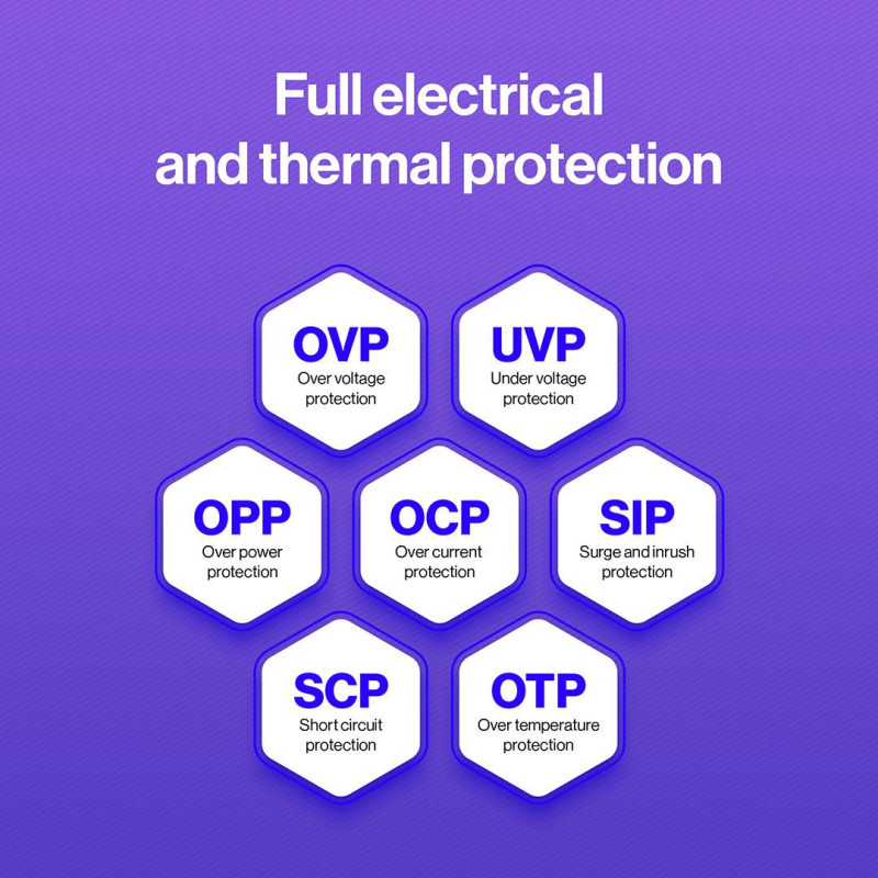 Įrenginys turi visą elektros ir šilumos apsaugos priemonių rinkinį. Tai reiškia, kad jūsų sistema yra apsaugota nuo perkrovų, įtampos šuolių, trumpųjų jungimų ir maitinimo šaltinio perkaitimo – užtikrinant stabilumą ir saugumą net ir netikėčiausiose situacijose.