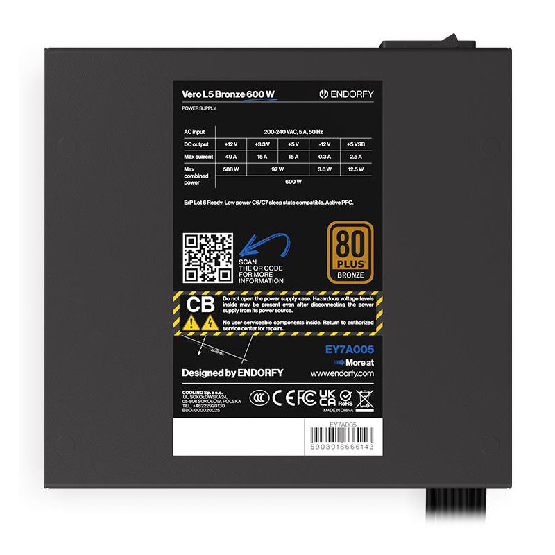 | Santrauka | ENDORFY Vero L5 Bronze 600W. Bendra galia: 600 W, AC įėjimo įtampa: 200 - 240 V, AC įėjimo dažnis: 50 Hz. Pagrindinės plokštės maitinimo jungtis: 24 kontaktų ATX, Pagrindinės plokštės maitinimo laido ilgis: 57 cm, SATA maitinimo laido ilgis: 500 mm. Paskirtis: PC, Maitinimo bloko (PSU) formos koeficientas: ATX, 80 PLUS sertifikatas: 80 PLUS Bronze. Produkto spalva: Juoda, Ventiliatoriaus skersmuo: 12 cm, Ventiliatorių skaičius: 1 ventiliatorius(-iai). Pridedami laidai: AC |