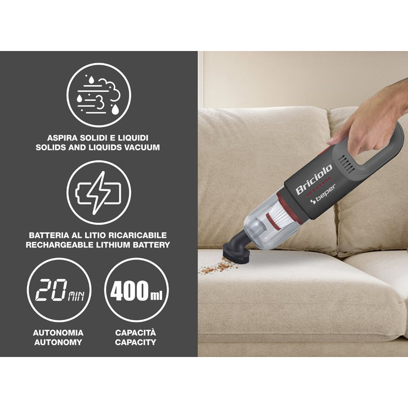 Kompaktiškas ir lengvas rankinis dulkių siurblys, tinkantis kietoms medžiagoms ir skysčiams siurbti, kurio bako talpa 400 ml.
